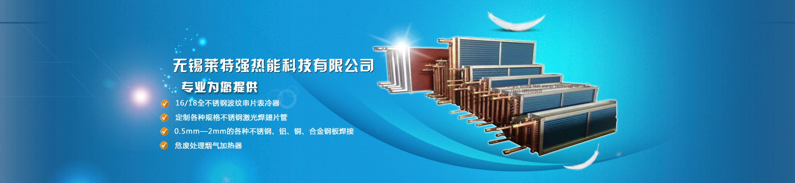 無錫萊特強(qiáng)熱能科技有限公司是專業(yè)生產(chǎn):銅鋁復(fù)合散熱器、鋼制散熱器、鋼鋁復(fù)合散熱器、(鋼鋁、銅鋁復(fù)合,鋼帶鋼管、不銹鋼、高頻、全銅軋制)等翅片管,空氣熱交換器,熱管換熱器,空氣冷卻器,螺旋板式換熱器,列管換熱器,冷凝器,煙氣加熱器、余熱回收、TSR盤管的公司。
